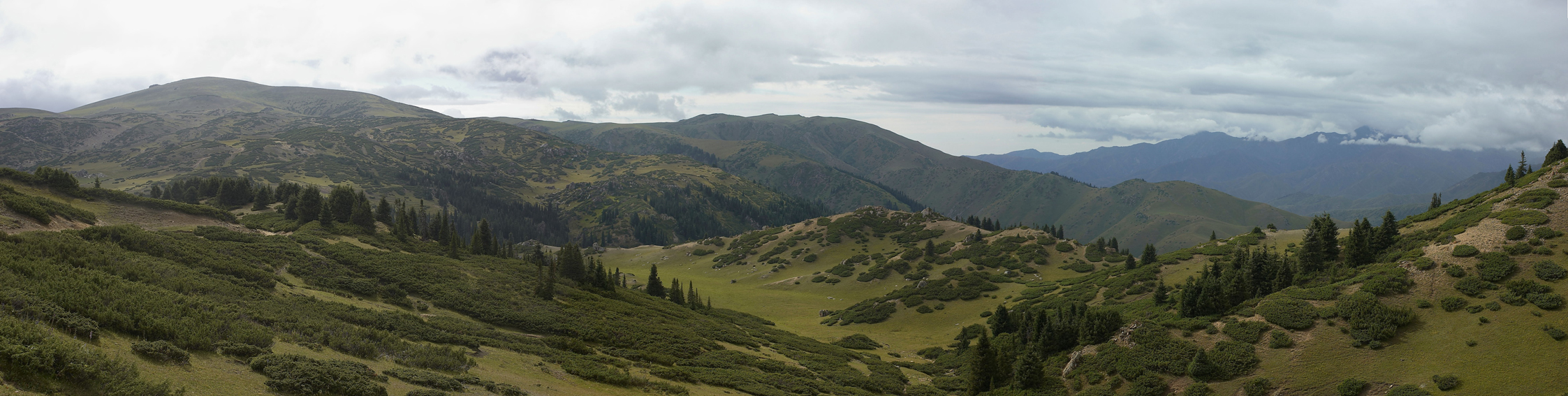 Изначально на спуск по долине Урман-Биена мы закладывали 2 дня, поэтому встали только в 8.00, а собирались неспешно. Вышли в 10.30. Пройдя 100 метров от лагеря по заболоченной пойме, по одной из тропок поднялись на высокий левый берег реки (фото 98). Через какое-то время тропа опять спускается к Урман-Биену, обозначаемому на некоторых картах как Карабулак. Река по этой части долины течёт очень спокойно, создалось ощущение, что перейти её можно практически в любом месте (фото 99). В какой-то момент появилась набитая тропа, уводящая вверх - на старый, заросший травой, моренный гребень, идущий вдоль реки. В 13.15 вышли к небольшому озеру, расположенному в кармане морены (фото 101), а буквально через 10 минут встретили второе озеро, почти идеально круглой формы (фото 102). В 13.55 вышли на дорогу с колеей, уходящую влево от реки, и продолжили движение уже по ней. Через 20 минут увидели вторую дорогу, переваливающую через хребтик в соседнюю долину и, как ни странно, не пересекающуюся с нашей. Далее наша дорога выводит мимо кошей на гребень хребта (фото 103), по которому очень плавно спускается к равнине, где уже можно различить посёлок Баласаз. Периодически нас поливает сильными дождевыми зарядами. Прикинув примерное расстояние до цивилизации, решили спуститься до посёлка в этот же день, тем более что стоянок с водой на гребне не найдёшь. Позвонили Айдыну в Текели (сотовый отсюда уже берёт) и попросили забрать нас на машине из Баласаза.