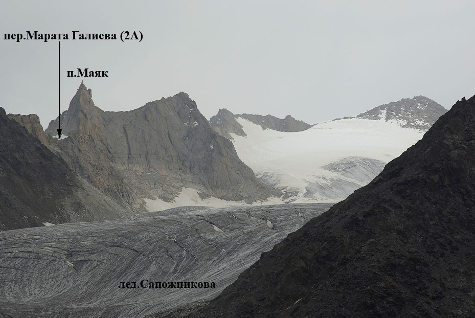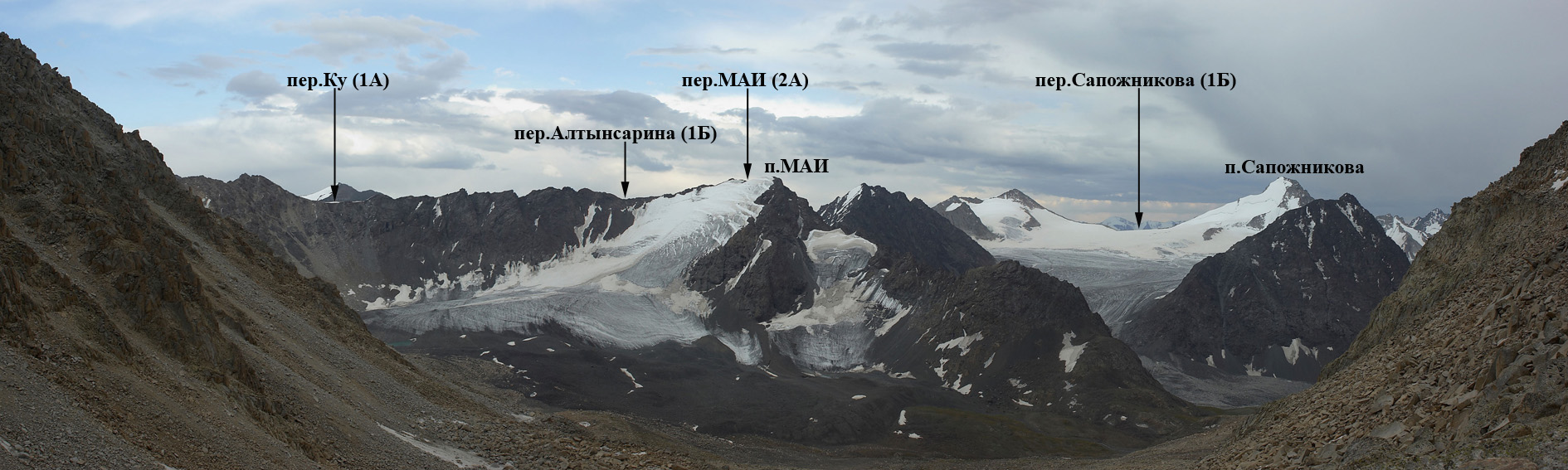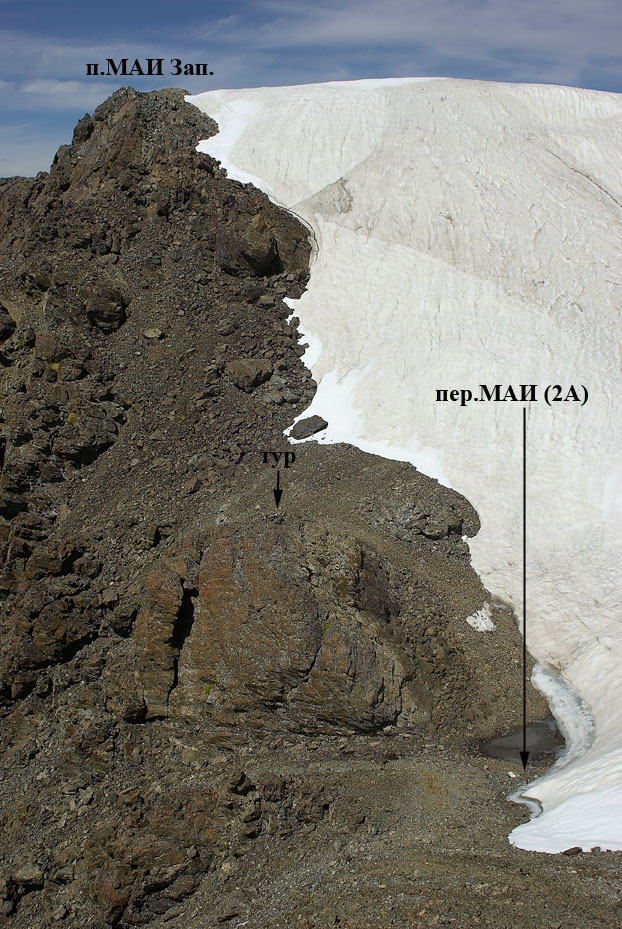 Перевал МАИ (2А, радиально по северному гребню пика МАИ, 3744 м).