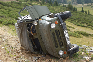 Далее двигались по тропе, огибающей Актобе с севера. За вершиной тропа слилась с автомобильной дорогой, идущей к горам Коктобе прямо по хребту (фото 4). Периодически шёл дождь, но идти по дороге это не мешало. Правда, утомляли постоянные наборы и сбросы высоты (фото 5, фото 7). По дороге иногда встречались юрты пастухов. В 16.20 сделали привал у перевёрнутого УАЗика (фото 8). Одним из немногих сложных моментов в ориентировании при движении по горам Коктобе является ответвление в сторону р.Коксу – т.н. «тропа Жанбас». Дело в том, что на картах это место обозначено неправильно. Тропа Жанбас отходит от основной дороги чуть дальше, чем это нарисовано на хребтовках и топокартах. Ориентирование осложняется тем, что как раз в этом месте дорога несколько раз ветвится. Побегав на разведки по окрестностям, мы смогли разобраться в расположении основной дороги и боковых отворотов (фото 9).