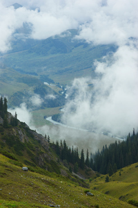 На ночлег встали прямо у поворота на Коксу – на неширокой перемычке между двумя хребтиками. Время 18.30. Правда, за водой пришлось сходить на 100 метров вниз в сторону р.Коксу. По утверждениям пастухов, подошедших вечером поболтать, при спуске с северной стороны перемычки есть родник поближе, но мы его так и не нашли. Координаты лагеря: N 44°47'09.5" E 79°07'53.7" 2298m. На юг сквозь просветы тумана виднеются предгорья Южной Джунгарии и р. Коксу (фото 11, фото 12).